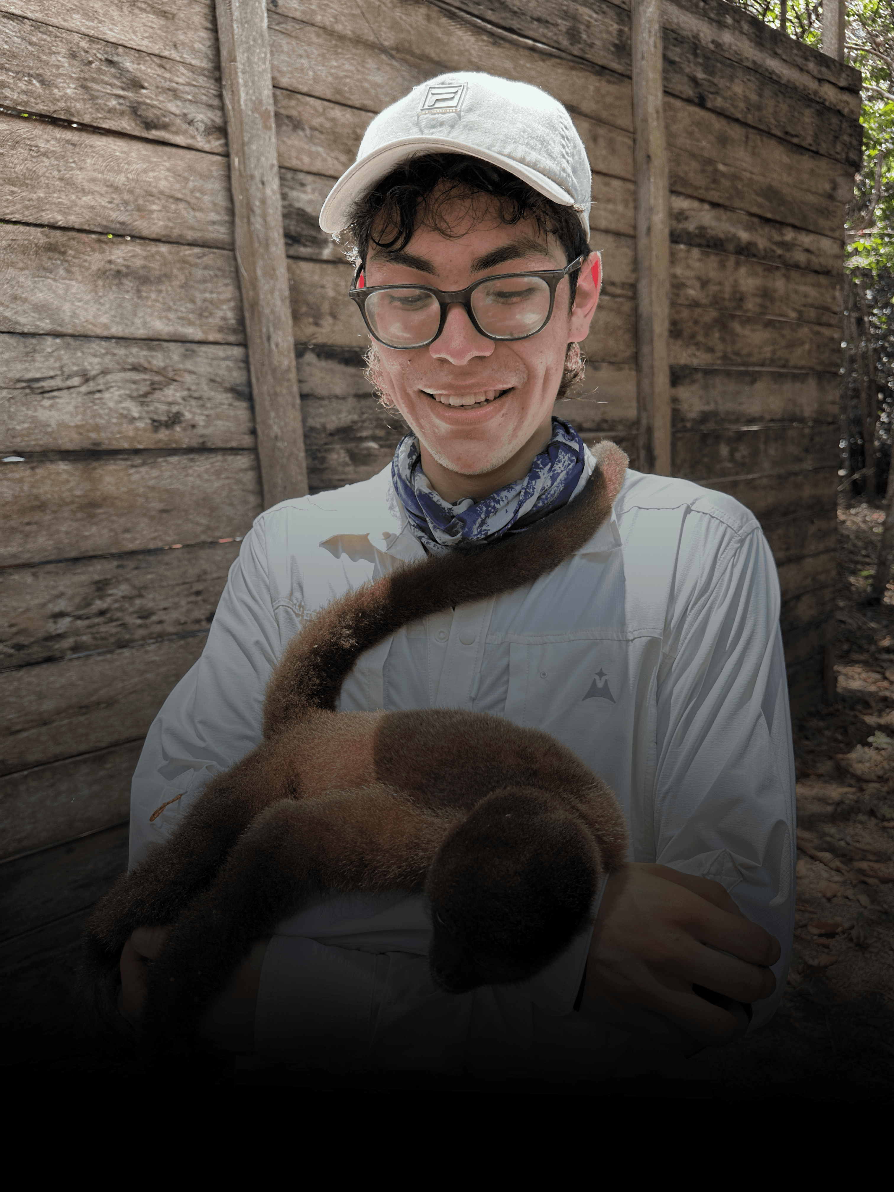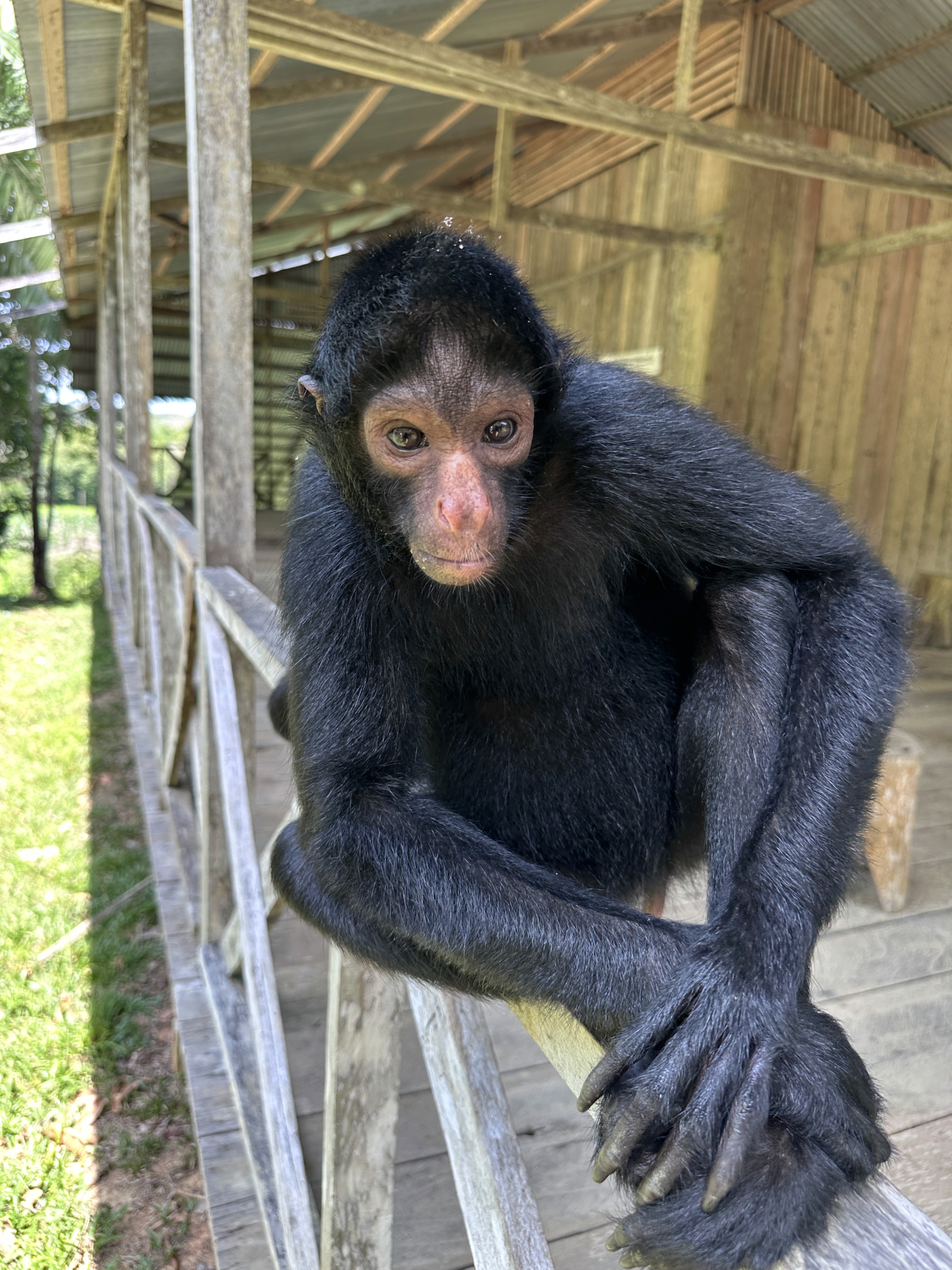 es un mono araña de vientre amarillo (Ateles belzebuth), una especie clave para el bosque. Su rol natural es dispersar semillas mientras se desplaza por las copas de los árboles, ayudando a la regeneración de la selva.