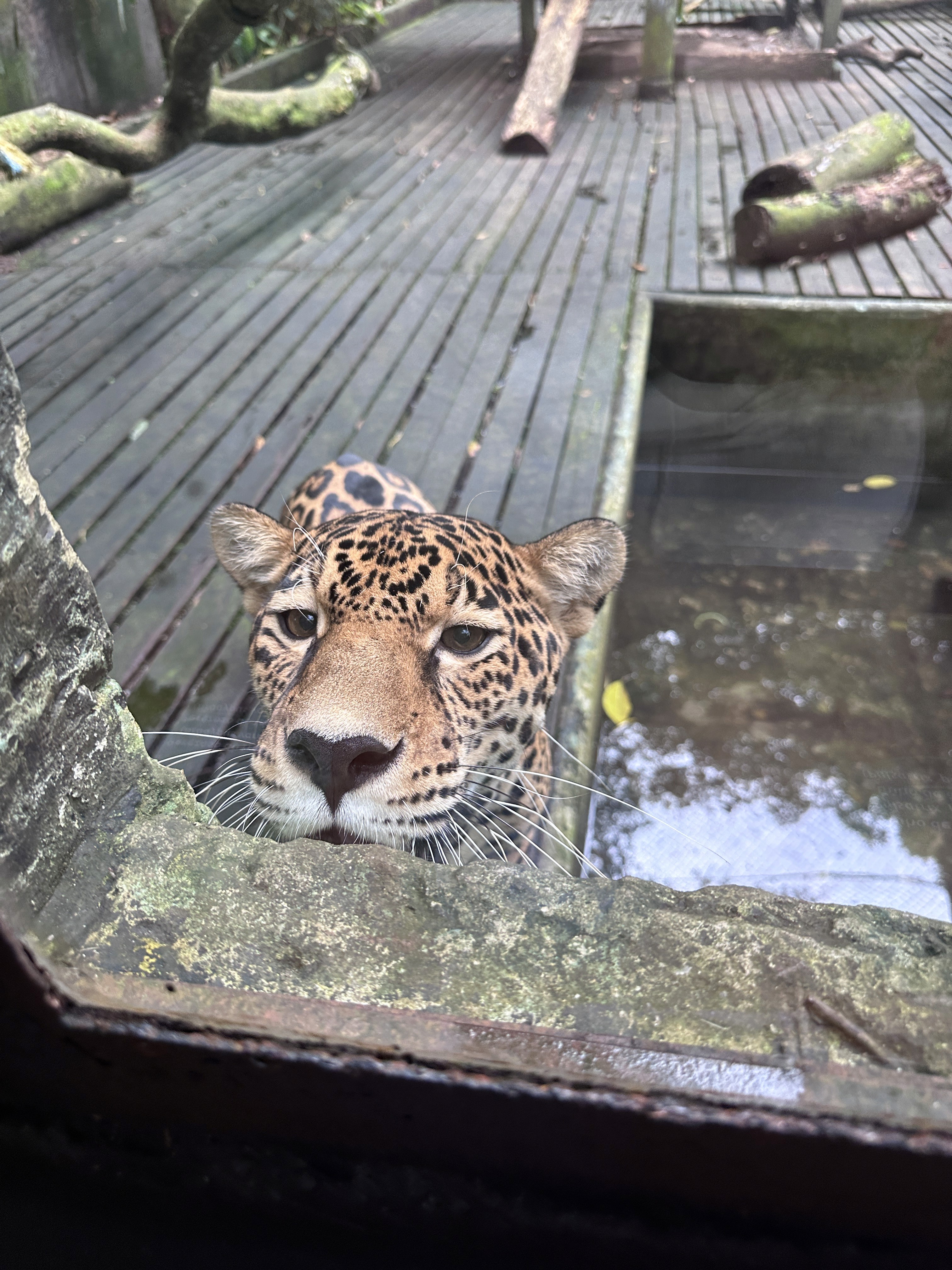 es un jaguar (Panthera onca), el depredador tope de la selva amazónica. Su rol natural es regular las poblaciones de otras especies, manteniendo el equilibrio ecológico y la salud del ecosistema.